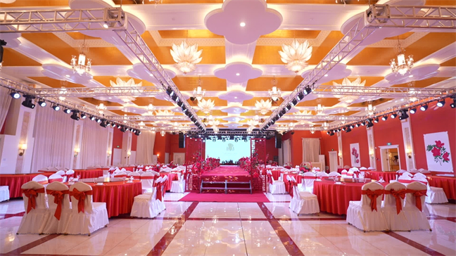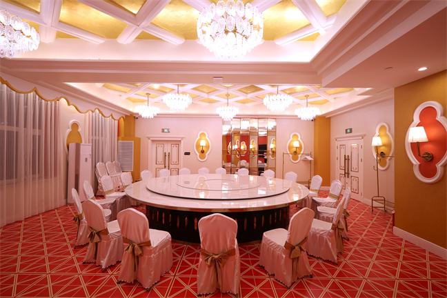 皇宮廳—金碧輝煌、皇宮式裝修,面積1038㎡,層高8.6米,配備愛情階梯、軌道威亞、二層觀禮臺、浪漫燈光秀、旋轉(zhuǎn)升降舞臺、頭頂天幕連接開合大屏。可承接50桌的大型宴會,也可舉辦600人的大型會議;還可用作會展、車展場地,每逢節(jié)假日還為市民上演文藝節(jié)目。